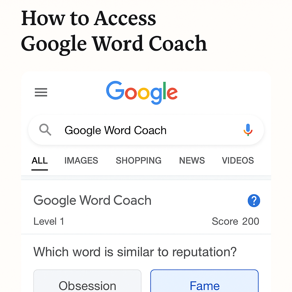 Google Word Coach is a built-in quiz-style vocabulary game that appears right in Google Search. Designed for quick learning and instant feedback, it challenges you with multiple-choice questions related to synonyms, antonyms, word meanings, and sometimes image-based associations.